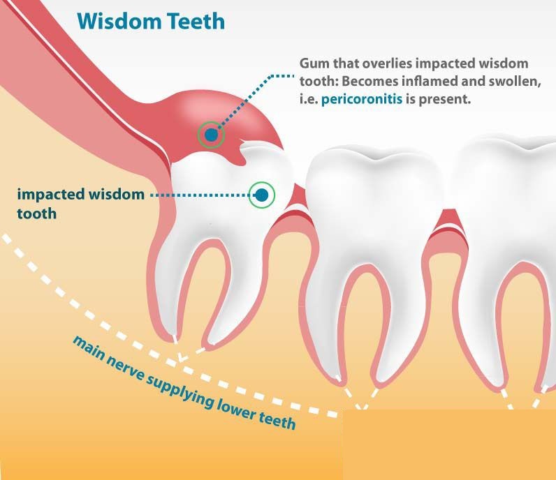 Pericoronitis is the inflammation of the gums above and around the tooth due to the overlying gum flap that causes chronic inflammation. This will result in a throbbing recurrent pain that will only resolve with the removal of the wisdom tooth.